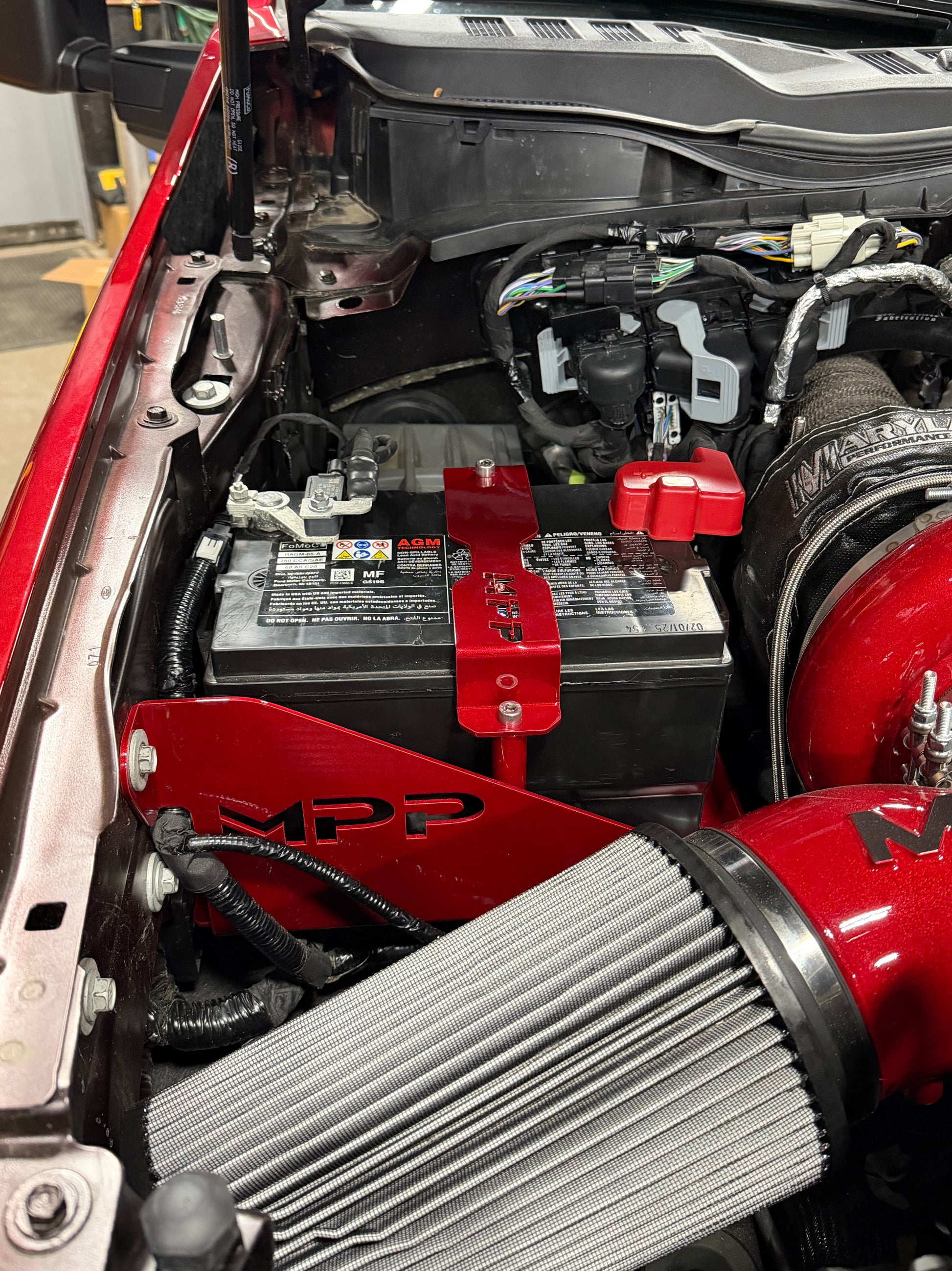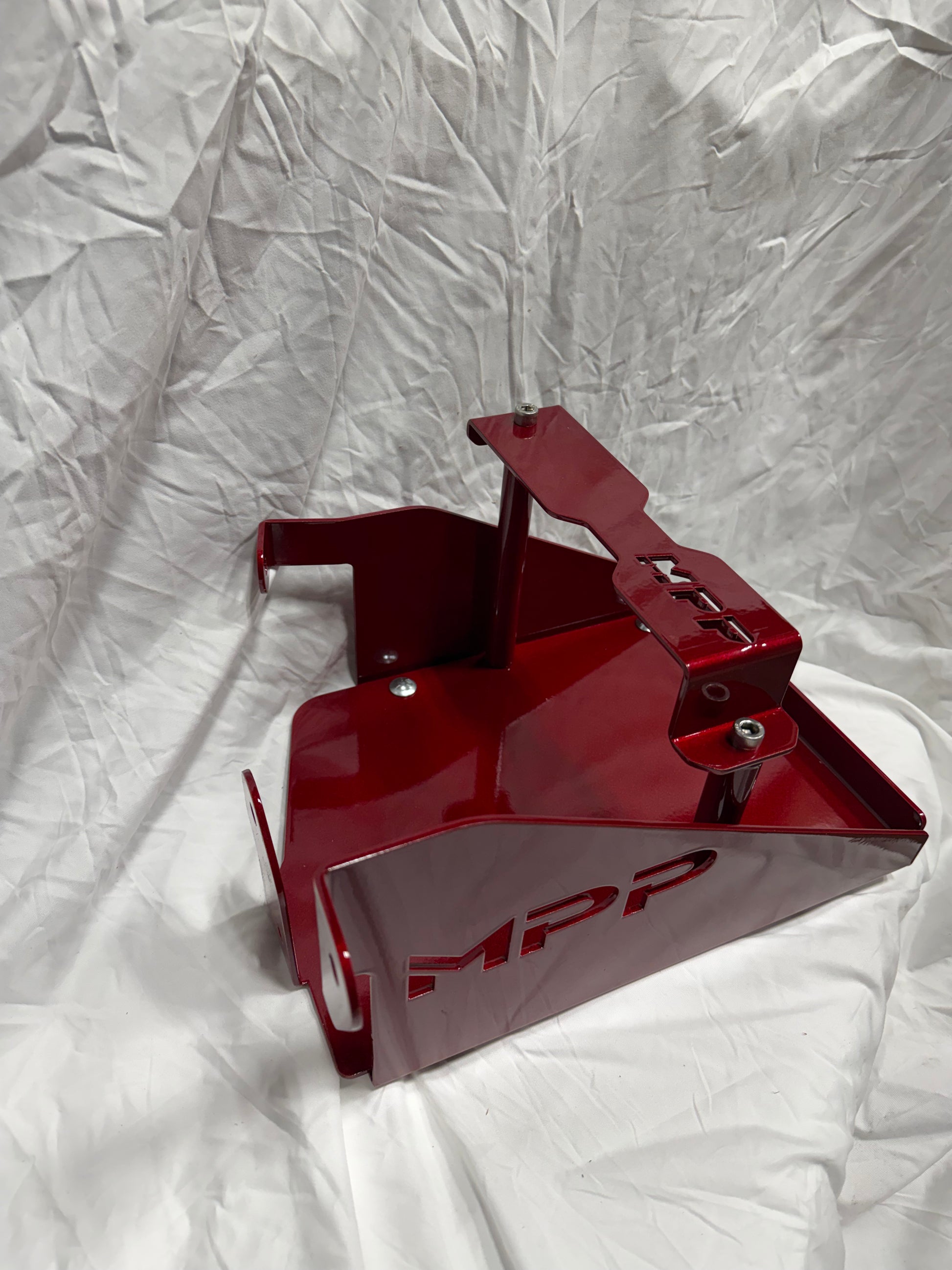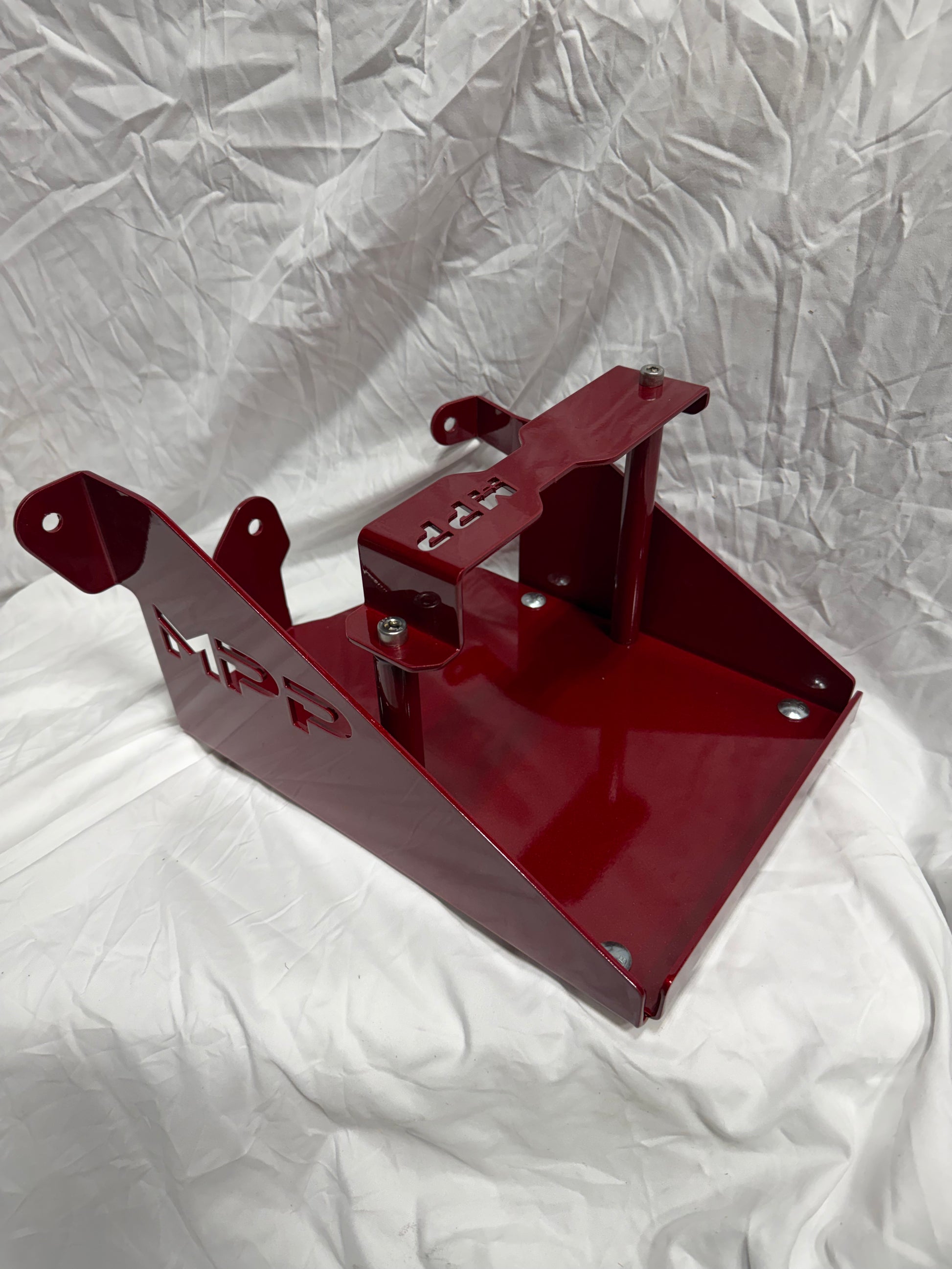 Our MPP 2023-26 Battery Tray is designed tuck your passenger battery into the corner tighter. This allows you to have more room when doing compounds and free up space. It also allows you to ditch that ugly plastic factory tray! Our MPP tray is made from Aluminum, and it includes the tray it self and battery hold down.